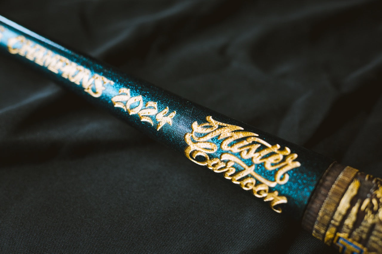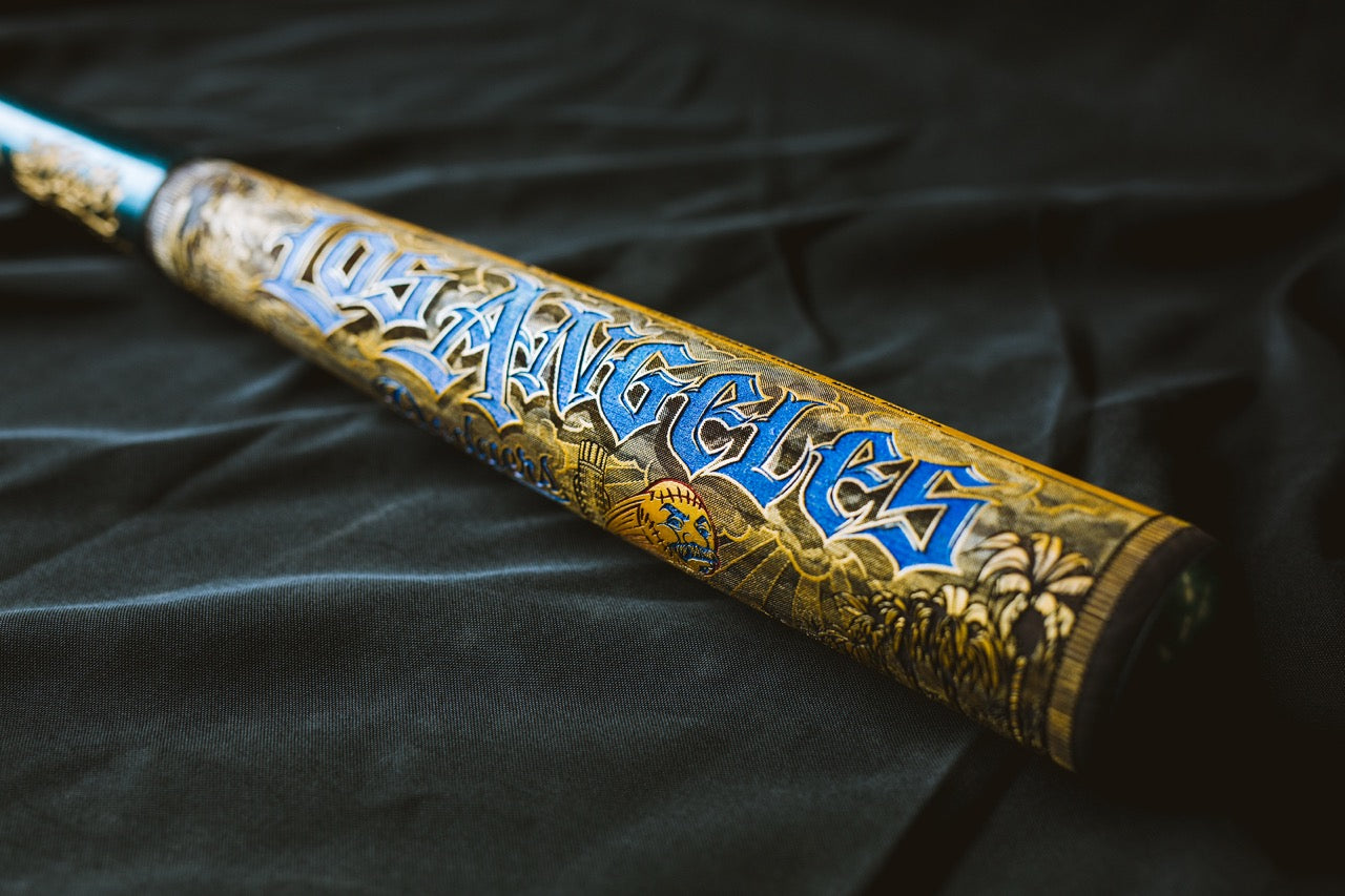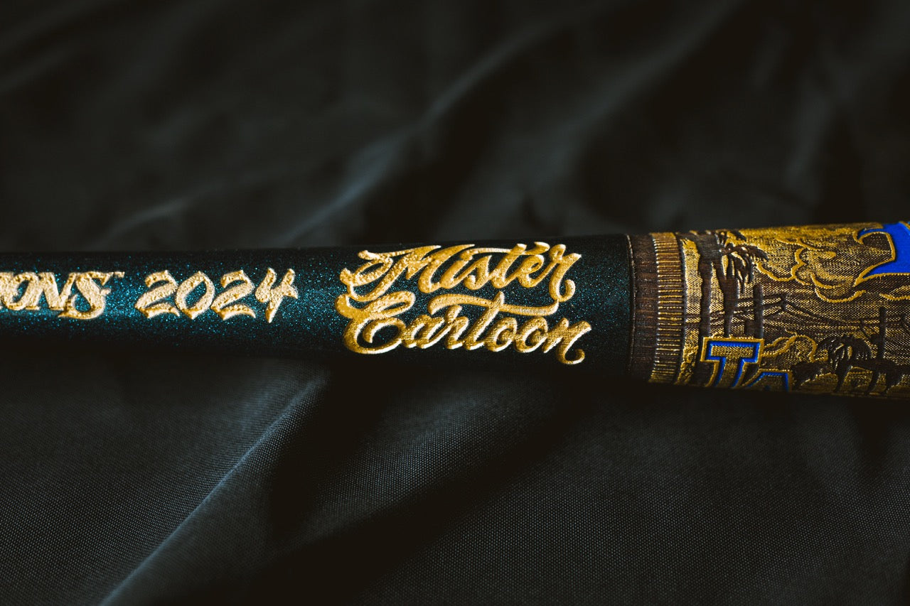 The premium Gold Edition World Series version of the Mister Cartoon mural bat features hand-painted spot colors throughout the mural design and custom metallic flake paint on the handle keeping true to the custom work of Mister Cartoon's automotive paint jobs.