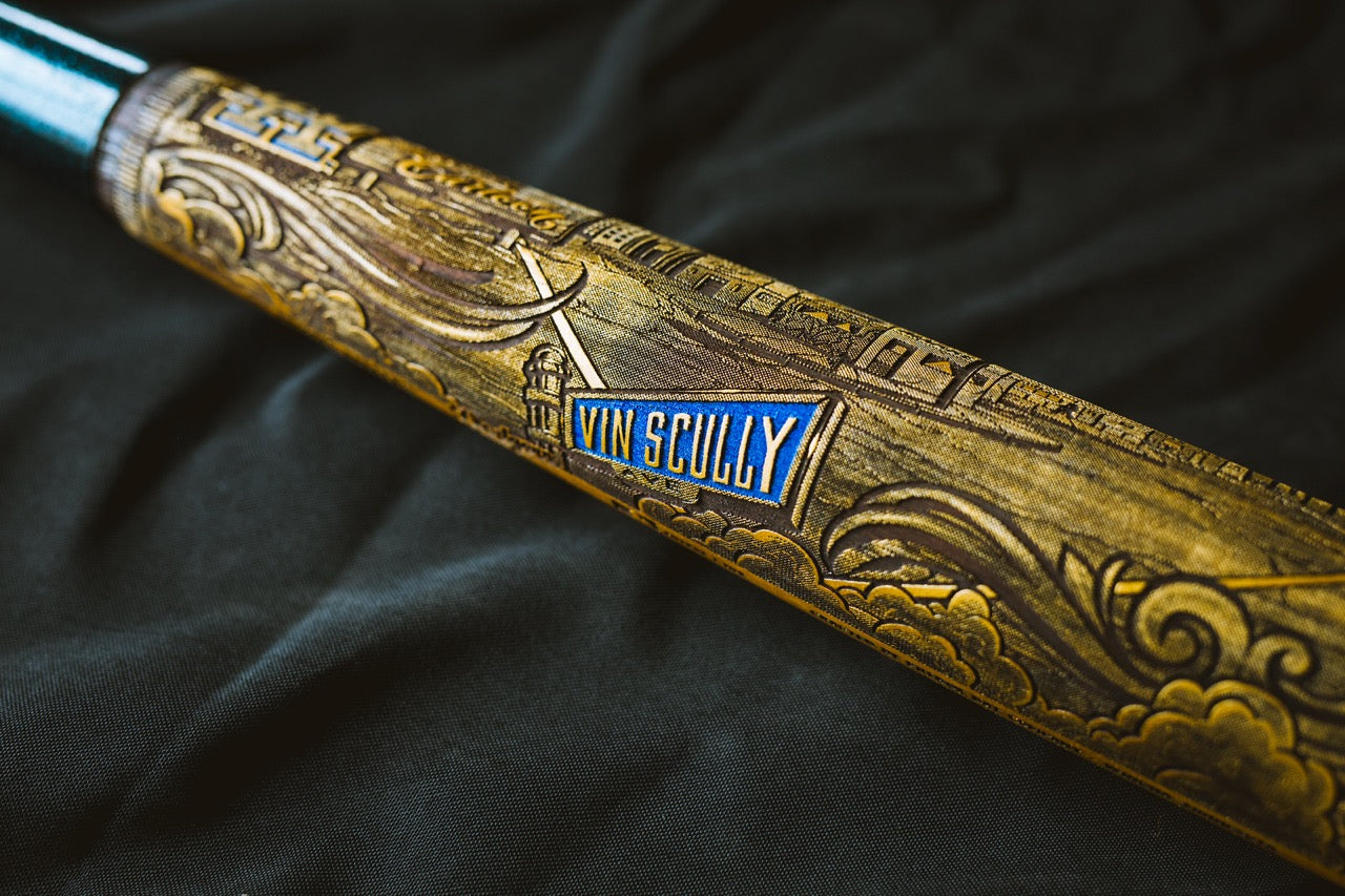 The Mister Cartoon artist series is truly a work of art. Designed originally as a mural that graces the Dodger stadium, we worked closely with Mister Cartoon to translate it onto a collector bat. Each is turned, hand-painted and laser engraved to perfection in the Pillbox shop.Every Pillbox bat is crafted at our shop in Winona, Minnesota. Each bat in 'The Mural Series' is crafted of high-quality maple, 34" long, laser engraved, and has the signature Pillbox logo pin inlaid into the knob.