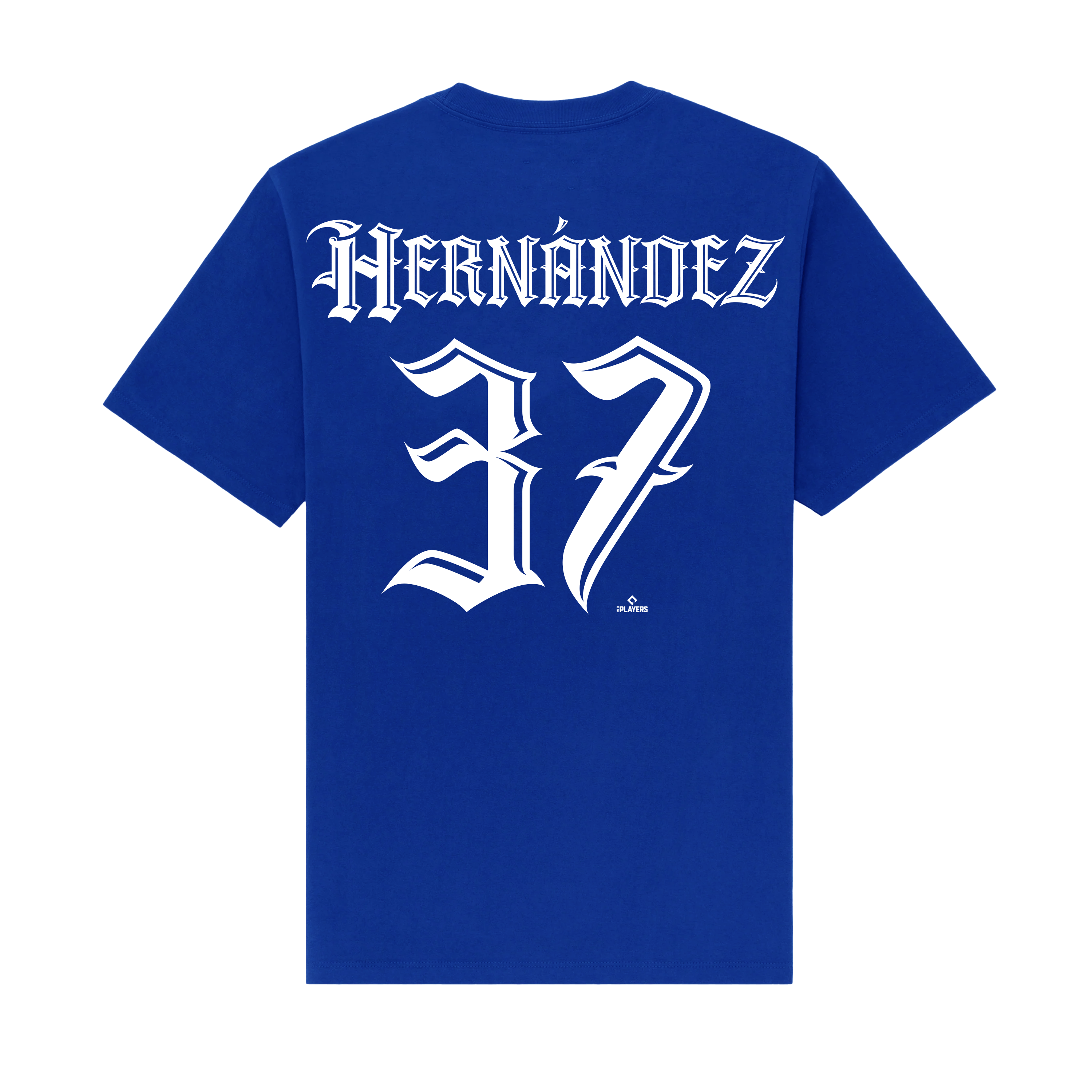 A blue Nike tee featuring the iconic Mister Cartoon Logo, Teoscar Hernández name and number redesigned by Mister Cartoon in a signature one of a kind font and style with the traditional Dodger script on the chest.